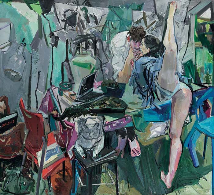 閆平的創作過程多數會借用模特,這是她習慣的繪畫方式,同時她對這些模特動態的觀察和捕捉也直接影響到作品主題。創作于2016年的《在希臘的畫室里》就描繪了疫情前她帶著學生游學希臘時在租借的工作室寫生的場景,畫面中當地模特獨特的氣息,讓她產生了不一樣的創作靈感:“那天來的模特有紋身并且紋在了女性特征的部位,讓我感到了情色,想著畢加索的因那些情人們而發生的那些好作品,想著弗里達·卡羅一生的病疼和愛情所帶來的那些令人難忘的自畫像,還有我身邊年輕的孩子們的興奮,有聲有色。我也常常觀察這些兩性的美好并試圖在其中發現創作的源泉?!迸c此同時呼應著的還有創作于2018年的《走,我們到哪里去》,模特在室內如鳥兒般飛翔的姿態雖處于畫布的右側,但卻成為了整個畫面的中心,并引導著觀者從這些人物向四周的空間展開看畫。