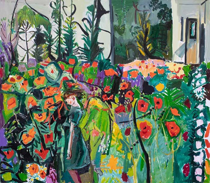 此次的展覽作品《心里的翅膀》是閆平的最近新作,“深夏又到了小城的工作室看到院子里滿目的花開,那一刻耳朵有一種萬物融在一起的轟鳴聲消失在了天邊。靜悄悄的世界,眼中只有花開的驚奇,耳朵聽到了枝蔓的伸展,彌漫整個上空的花香讓我只能想著畫畫的事情,什么俄烏局勢,新冠疫情,核酸檢測都遠遠的消退了。滿園子花的枝蔓都相互較量著向上升騰,而因為披掛著葉子和枝梢上的花朵,使那些枝蔓微微彎下,猶如我心中隱形的翅膀?!边@種狀態下的創作感受,與她創作于2014年的《蝴蝶是自由的》形成有趣的對比,這是一幅自畫像,藝術家以破蛹而出的蝴蝶作為自我象征,描繪過去生活中因追求自由而做出的選擇各種不自由的生活方式。