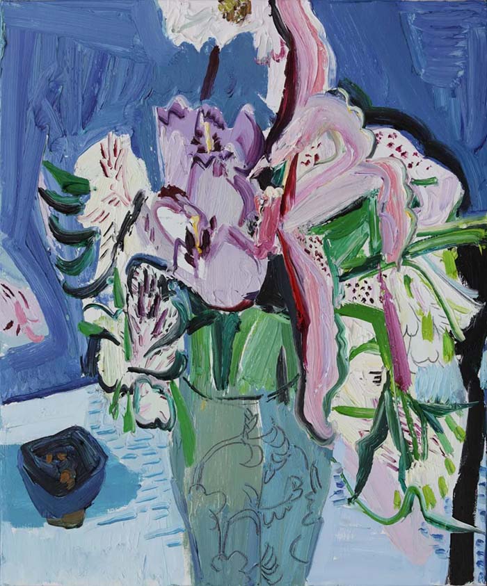 這次展覽中,四件花卉作品將整個展覽的基調定格在一種生機和喜悅之中,鮮明的筆觸,短促和綿長交錯相織。明朗的色彩,寶石藍和粉紅的纏繞,充滿了希望、自由和奔放的氣息。閆平這么描述:“每一次畫花都是一次心靈的洗滌。過去的多年里,當我不快樂或心感疲累,我都去買一大抱花送給我自己,暫時隔絕與外界的聯系與花兒同處,在它們那里感受歲月的秘密而倍感安全?!?/p>