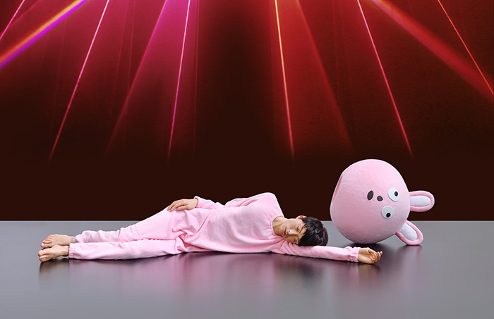 延續了藝術家長期創作中善于將傳統美術館轉換為具有戲劇感的空間的特質,在此次展覽中,藝術家將BY ART MATTERS天目里美術館的一層展廳布置成了一間完整的俱樂部——舞池、舞臺、存衣處、入口處的簽到板,一切都仿照真實的俱樂部空間一一建造。與真正的俱樂部有所不同,在整個展期間,來到這里參觀的觀眾并不會聽到由DJ所播放的音樂——與之相反,充斥在這里的聲音是由各種俱樂部的“幕后活動”混雜而成的——譬如派對后清掃空間的聲音或是正在為下一場派對進行準備的檢查工作所發出的聲音。而由藝術家所創造的不同雕塑形象也散落于展廳,從穿著粉紅兔子服裝的疲倦年輕人,孤獨的寵物狗到懸于半空中俯視觀眾的雜技演員,這一切都在預示著某種派對即將開始或剛剛散場的中間狀態。