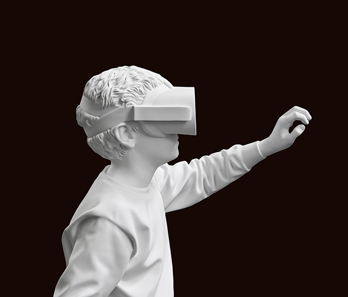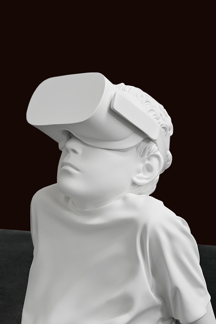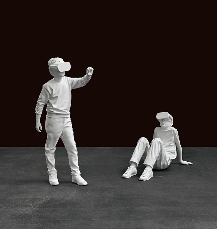在美術館六層的展廳中,具象雕塑和大型裝置作品《短篇小說》(Short Story)為觀眾構建了一個對比強烈的迥異場景。裝置作品《短篇小說》呈現了一座網球場,昏暗的燈光及散落在球場中的人物造型雕塑在靜幀般的場景中為觀眾帶來了進入敘事語境的可能。而在別處,兩名男孩形象的雕塑頭戴VR設備——因為表情被遮蔽了大半而化為某種賽博格般的生物,觀眾永遠無法得知他們在看什么。展覽中這部分作品玩味于目光,訴諸于內在的感受或糾葛,它們邀請觀者進入莫測的世界——這世界以近乎離奇失真的方式講述成長與塑造命運的艱難。
