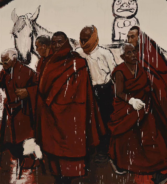 李曉剛同志有很好的學歷,早期原在解放軍藝術學院畢業,后來又到日本京都藝術大學等處留學,對西方油畫歷史以及技巧等領域已頗為熟悉,又關注了文藝復興早期蛋彩畫(弗朗切斯卡)等技法的操作,他回國后,再度到我們美院深度進修油畫寫實的新傳統。近年來還持續在李庚先生主導的李可染畫院教授弗朗切斯卡濕壁畫等課程。這次參展的作品中《汲水的女人》一圖,是他當年在高研班時期,在詹建俊老師指導下的出色作品。他的壁畫性大作《甘南拉卜楞寺僧眾圖》為山東收藏家所定制和收藏。此次參展同款作品是專為本次展覽重新加工精制,它出色地將名寺的風光、僧以及僧俗兩種生活雙向綜合深入,具有鮮明的創造性。