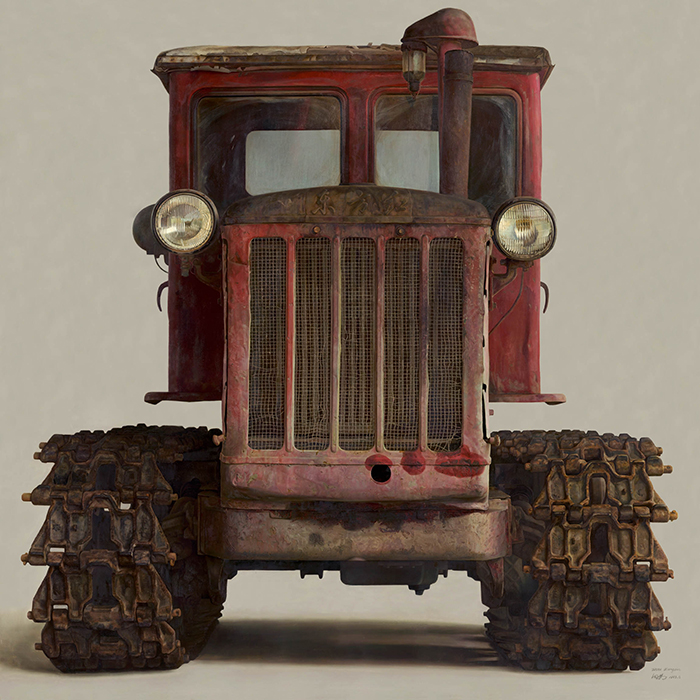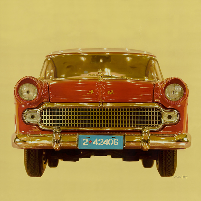細膩逼真地寫生“東方紅”號拖拉機時,剝離了背景的對象被標本化,保留了歷經滄海桑田的各種痕跡,供人在當下和過去之間穿行。解放CA10、東風金龍、北京BJ212、上海SH760、紅旗CA770……這些具有實用功能的汽車,在特定的時段和情境中,曾被賦予了相當重要的文化價值。當藝術家把它們的模型(比原車縮小了多倍)在畫布上放大到原車尺度,用照相寫實手法重現時,三維的原車、縮小的模型、放大的二維圖像之間,透疊出豐富的意味來,視覺刺激作為起點,啟動觀者的人生經歷和知識儲備。何況,周向林的畫面中,這些模型身披密集的光斑,散發炫目的夢幻氣息,超出物理的心理意味更加深長了。
