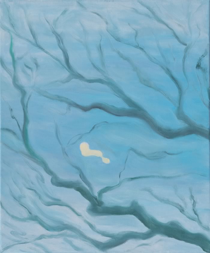 在很多人的印象中,鹵貓以畫花見長。實際上,夜晚皎潔的月光也是他創作靈感的重要來源。策展之初,當我們把《月夜》和《moon river》放在一起時,他告訴我們《月夜》是天上的月亮,《moon river》是水中的月亮。他畫的月亮好像是另一個分身,褪去五光十色,純凈的畫面和花一樣給人治愈的能量。于是,展覽有了一個深藍色的空間,將所有與月亮有關的作品裝進去,并通過影像裝置表達鹵貓世界的“月亮”。