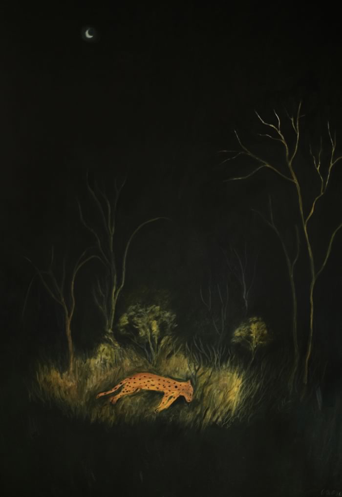 《月光下的豹子》靈感源于鹵貓在南非Safari的旅行經歷:“我們在白天跟著向導看了群居動物們,豹子是在黑夜里的最后?站,我不知道向導是如何在漆黑的夜里鎖定豹子的方位的。我們靠得很近,豹子也沒有要移動的意思,在月光下安靜的躺著,這樣的畫面會讓我想起自己夜晚的狀態,放空,疏離”。