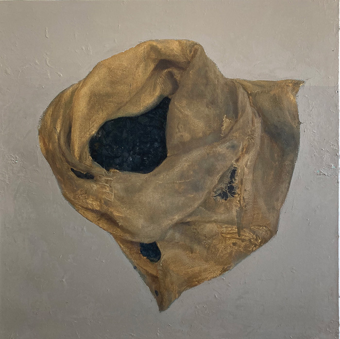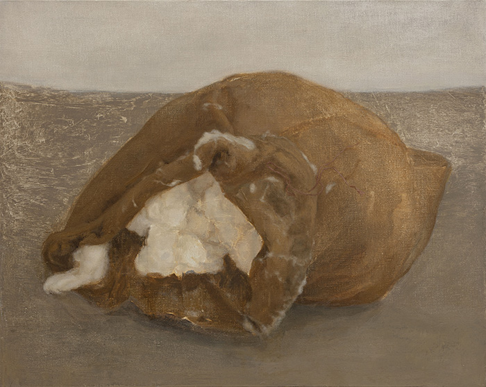 在張新軍的繪畫中,畫面的主體是一些并不具體的最基本的物質元素,麥子、棉花、土塊、煤塊,它們或被包裹在容器內,或散落、靜置于空間中,或可看作是一種對肉身的替代。張新軍以平實直接的語言,刻畫這些與人的生命相關的原始材料,同時也是在刻畫他對現實世界的感知與理解,并與逐漸消逝在日常經驗中的事物再度建立聯結。
