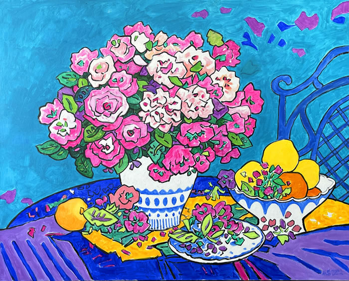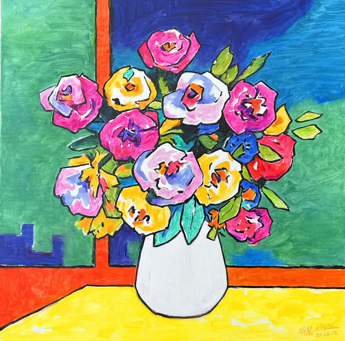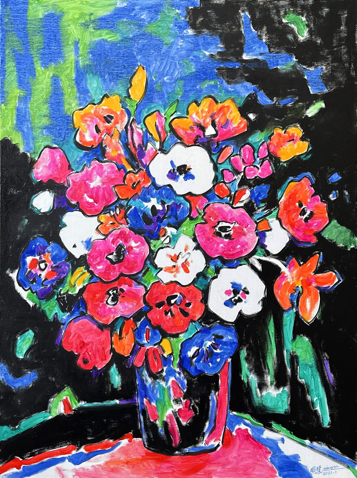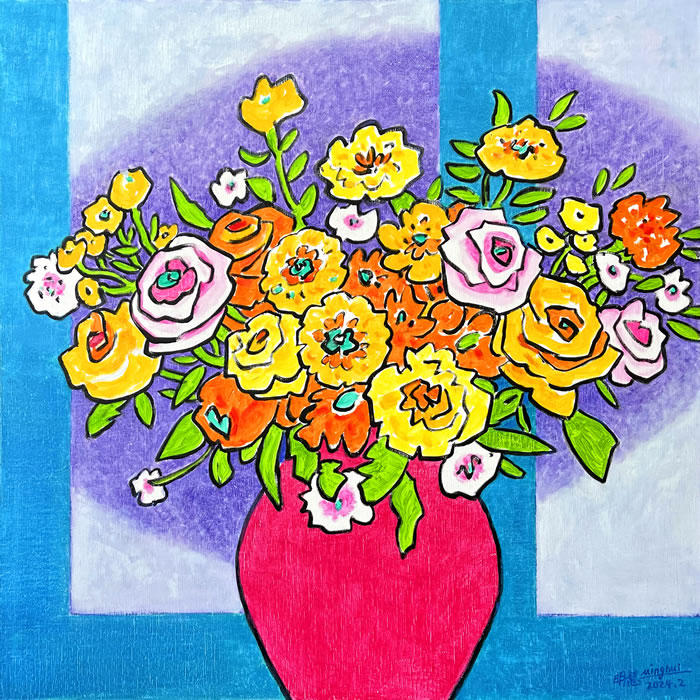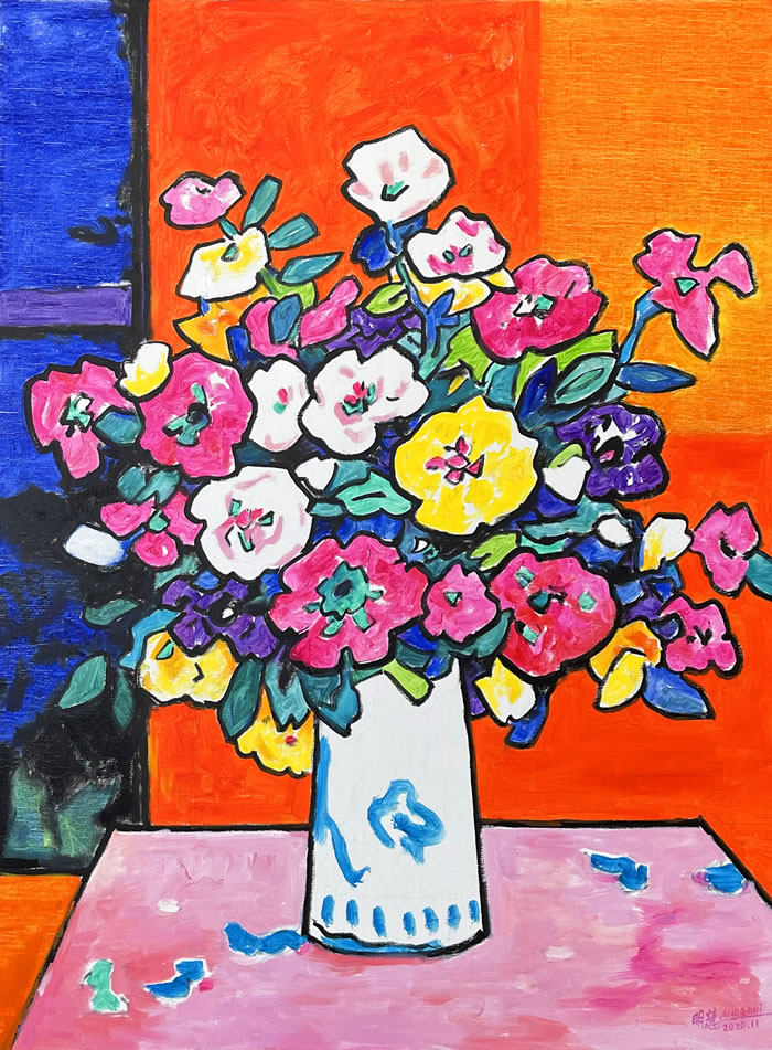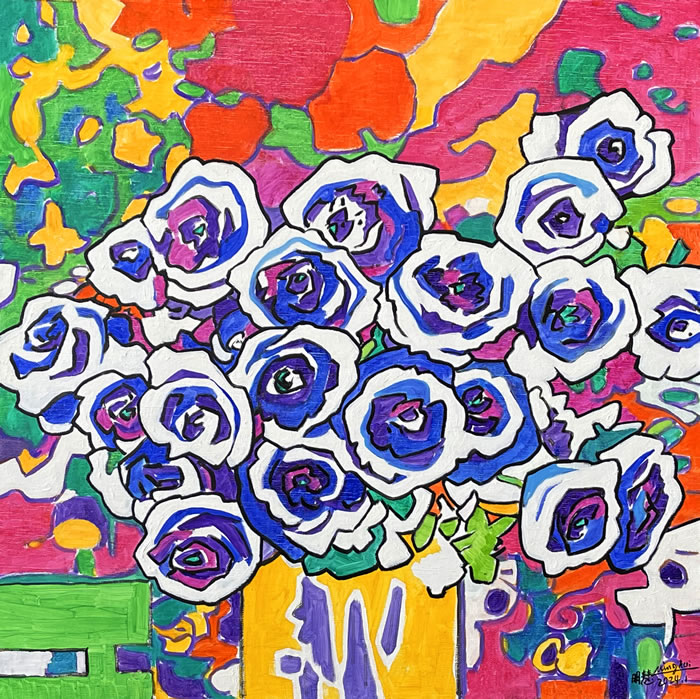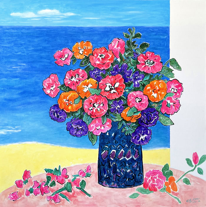 因為愛花兒,我借花畫語訴說情懷,借繪畫本身把我內心對花兒最美好的愿望鎖定在我的畫面里。我嘗試著用我自己的方式表達對花兒的情感和情緒。我不斷地追求在繪畫語言上的精簡和形式美的探索,不刻意強調畫面的立體與空間,而是通過高純度色彩間的構成關系來營造花兒與花兒競相斗艷的強烈視覺效果,盡可能地將花兒的美麗與生命力展現得淋漓盡致。強烈的色彩對比是我對花兒的感悟和發自內心的真實情感和情緒表述。