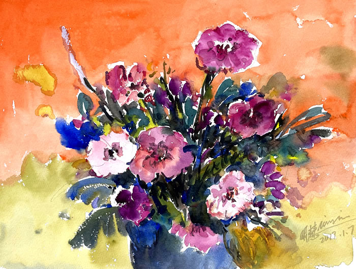 花兒與生俱來的美麗和個性,只有用心去觀察去感悟才能真正發現它們內在的美麗和神奇。 在大學一年級學習《裝飾花卉》課程的時候我對花兒就有了一知半解的認知。早年的水粉畫、水彩畫靜物寫生作品花兒又是我比較喜歡多用的素材。隨著對花兒的喜好和認知的提高,從2006年開始我創作了一批干花兒系列作品,2013年以后花卉創作基本上成為我繪畫的重要題材。