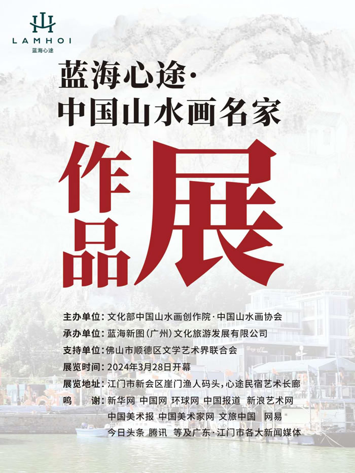 藍海心途?中國山水畫名家作品展,將于3月28日在江門市新會區崖門漁人碼頭,民宿藝術長廊開幕。此次展覽由文化部中國山水畫創作院和中國山水畫協會主辦,佛山市順德區文學藝術界聯合會為支持單位,藍海新圖(廣州)文化旅游發展有限公司為承辦單位。展覽展出著名山水畫家周本波和陳安茗30多幅中國畫精品。