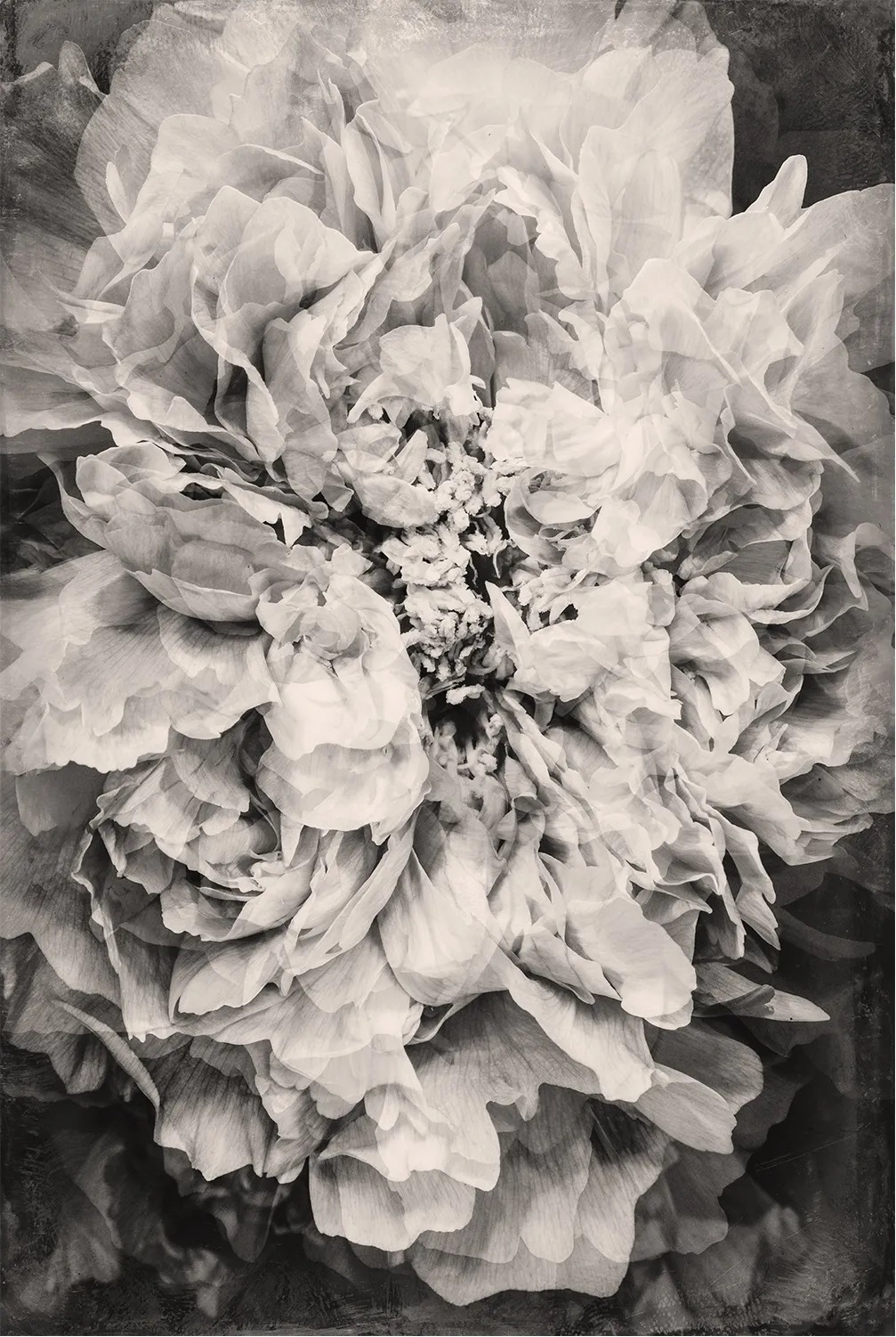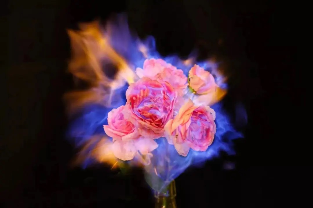 花兒被大火吞噬,火焰捕獲了花朵凋謝前美麗的瞬間。這一系列共有15幅,每一朵花兒都是獨立呈現——一個搭配和諧的花束、一朵盛開的盆花、一個凋謝的花朵。在這張作品中,黑色襯托著粉紫色的牡丹,最簡潔的素材——鮮花和火焰,將渴望、記憶、希望、愛、命運、死亡、全部匯入作品中。