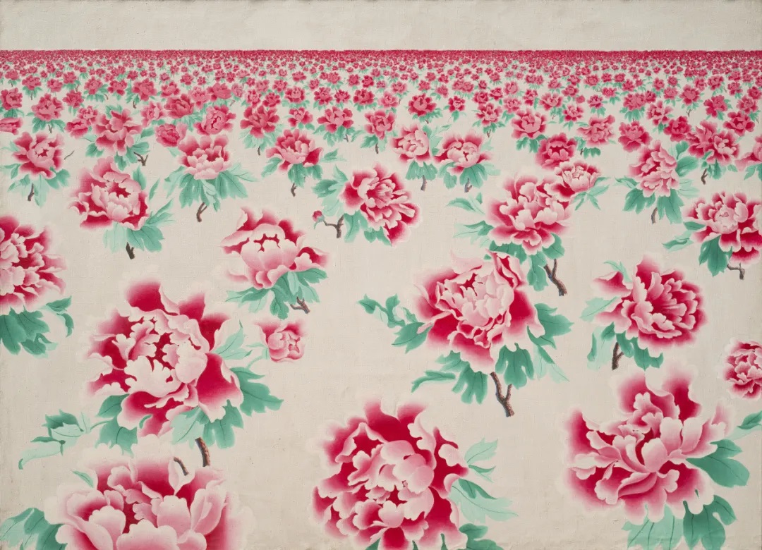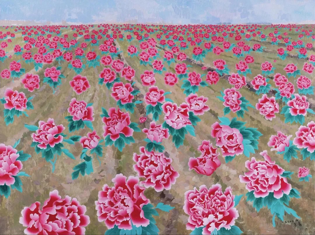 王音與民間畫師合作,在自己的創作上,讓畫師們批量復制艷俗的牡丹形象,有序地布滿整片畫布。大朵的花兒仿佛從泥土中兀自生出,恣意開放至狂歡熱烈,直至開到了土地的盡頭,與天空相連。藝術家用大筆觸描繪天地,天之輕、地之沉,皆在自信且大膽地寫意筆觸中得以體現得淋漓盡致。然而,那高度細節化、猶如工筆般強調色彩過渡和瓣葉姿態的牡丹花陣,卻硬生生地與黃土藍天相生一處,而單點透視下的陣列排布又讓你無法將花兒們從土地中抽離開去。兩種審美、兩種意境、兩種情趣便這樣突兀地、強勢地、不合情理地存在于同一空間,迫使你去觀看,去審視,去接受。正如當年遍地可見的牡丹裝飾畫一般,在中國人民樸素的日常中,兀自開放著,打破一切審美的可能,成為一種真正草根的“趣味”,迫使著人們去習慣,去接受。