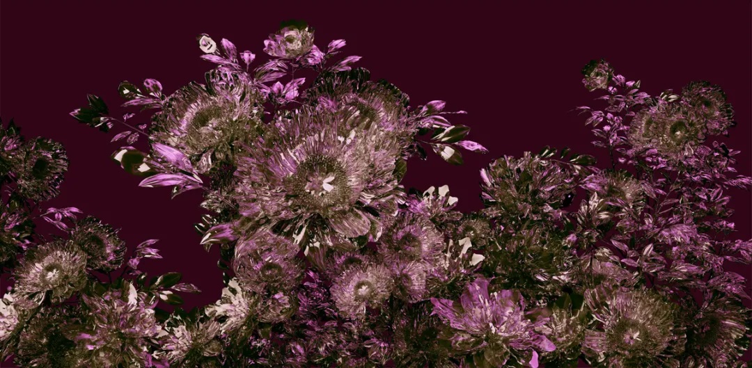 黃可一參考在淘寶網上暢銷的一批牡丹畫進行構圖,先用3D建模軟件將這些平面的牡丹畫立體化,再將立體牡丹模型渲染成晶瑩剔透的水晶般質感,然后通過圖形處理軟件將立體牡丹模型平面化,并通過調節光感和色彩使畫面呈現出絢爛斑斕、流光溢彩的效果。為了更好地突出水晶牡丹的璀璨和華麗感,圖中的背景處理成深紫紅色或深藍色,使整個畫面同時籠罩在典雅幽靜的氛圍之中。