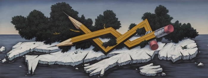 然而,展覽標題的“秘境”兩字應該緊接一個“問號”。博爾赫斯在《莎士比亞的記憶》中提到——人類的三個能力:記憶、理解、意志并非學究式的幻想。周松的“新自然系列”無疑是將這三個能力,最大程度的轉換到他的作品中為他所用。于是,“現實”與“超現實”的碰撞力,“穩定”與“非穩定”間的張力都蓄勢在他的作品里。他的藝術觀念也由此上升至“宇宙觀”與“人類學”的探索。他仿佛就是一個“哲學家”,先拋出一個問題——秘境?繼而,通過不同媒材和觀看角度的藝術創作,不斷辨證探索,制造出荒誕而真實存在的“思考結果”。