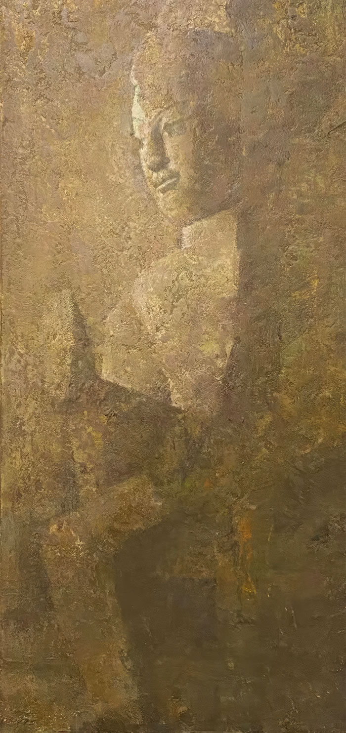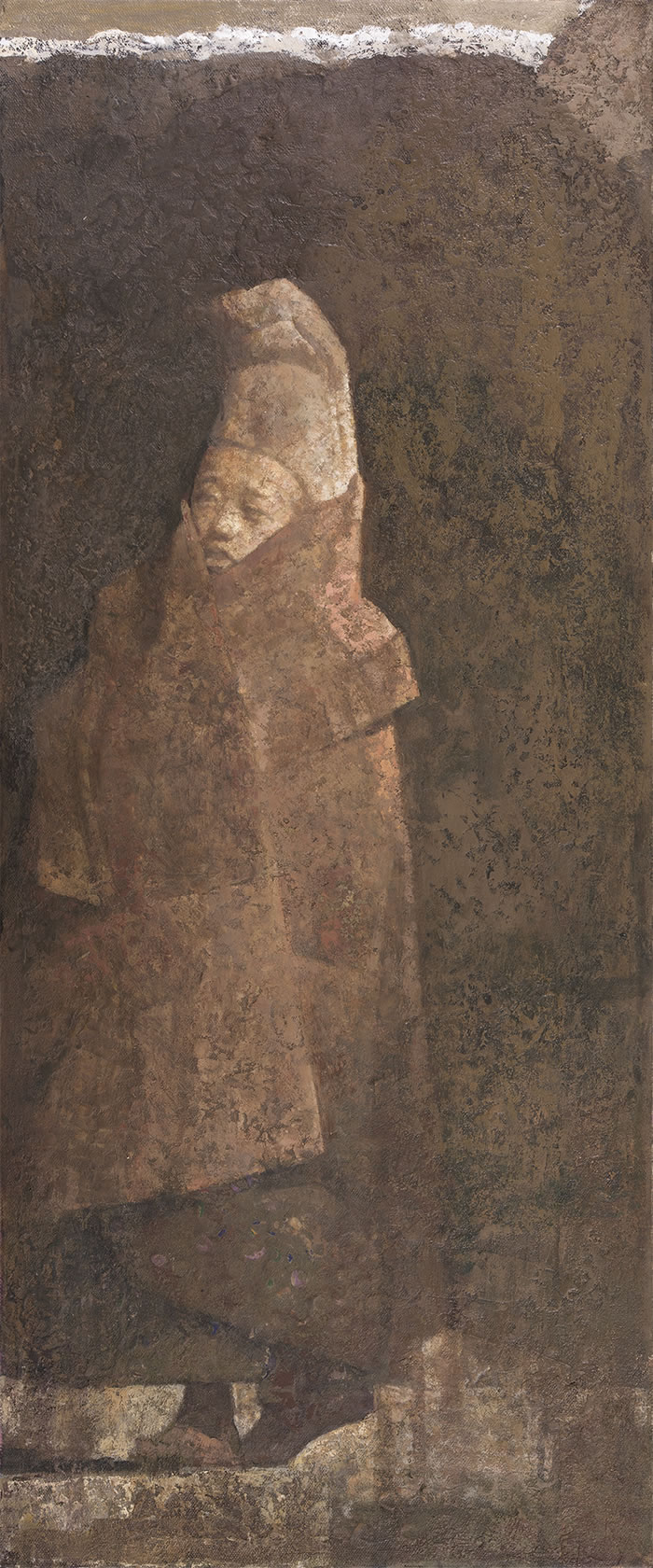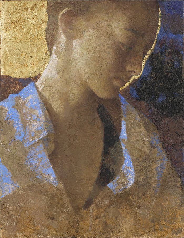 他赴日本二十多年,從濕壁畫入手,全面探尋和研究了歐洲坦培拉繪畫技藝的根源。從日本出發,足跡遍布意大利、比利時、荷蘭、美國等,寒來暑往,歲月更迭,藝術上的朝圣、取經,終于落實為個人的藝術成長與成熟,成為了坦培拉技法集大成的中國油畫家!他對尼德蘭技法的醇熟運用,令人嘆為觀止,其代表作品皆可為證,這次展出的《藍衣》,將鮮活的當代人物,置身于歷史時間浸潤的斑駁陸離的酪素色彩肌理之內,參以日本物哀的美學情致,形成了某種可意會而難以表現的神圣而神秘的意味,畫面所呈現的敏銳度和敏感性很強,顯示了畫家以精湛的尼德蘭風格對東方人物形象的塑造。