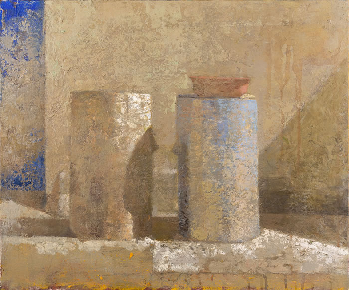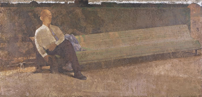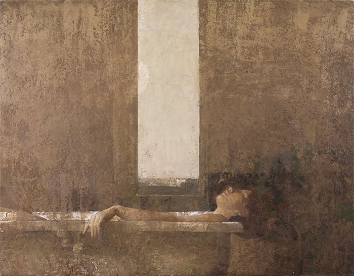 這次展出的作品,多為李曉剛先生近年新作,顯示了藝術家在多種技法運用上的新思路。材料以酪素坦培拉為主,復雜的中性色調,剝蝕的時光之感,與寧靜寂寥近乎神性的氣質統一。寫實性的繪畫,如何兼容畫家在表現與抽象上的追求,這絕對是一個藝術上的難題,許多畫家或許偏重其一,李曉剛的藝術同時擁有高度的寫實能力、材料的特殊性和風格的抽象構成,三者渾然一體。
