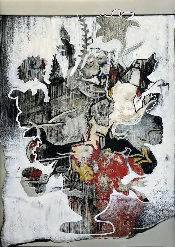 Because the bouquet as a concept is central to Lucienne’s recent artworks, her reference to the flowers themselves lies exclusively in the representation of their silhouette as a bouquet form in a vase. Contained within this outline are figurative or abstracted depictions of landscapes, women and myths that are sections of some of her previous paintings. In this way, each work is created by pairing a selected bouquet with a different underlay painting chosen because of its historic context and potential for both reflecting various moments lived and carrying new meaning forward. Paint is then applied variously inside and outside of this profile, uniting inner and outer in the present.