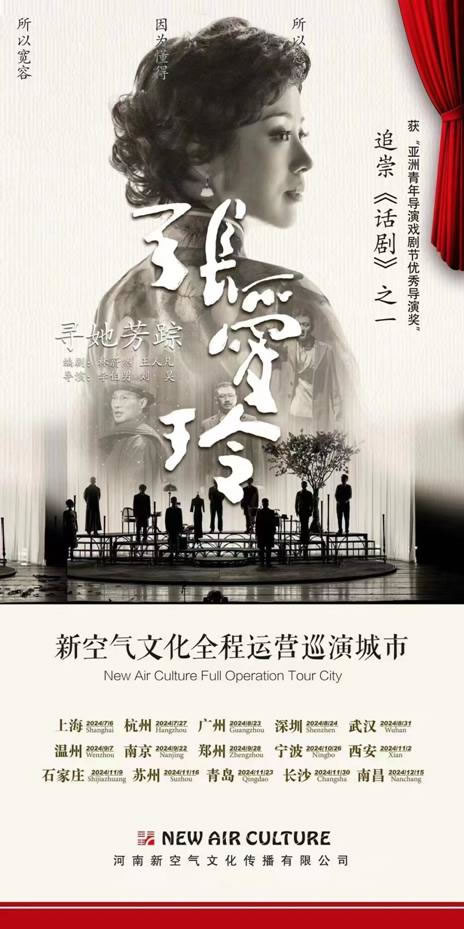 2024年,話劇《尋她芳蹤張愛玲》官宣開啟全國巡演,將由河南新空氣文化傳播有限公司擔任全程主辦,河南省華娛百納國際文化傳播有限公司承辦,由晟陽國旅、嗨果嶺文旅、思念果嶺園區、茗生香贊助,由大麥網、大河票務網、美團貓眼擔任官方票務,致力于為全國各地的張迷們呈現精彩的話劇演出!