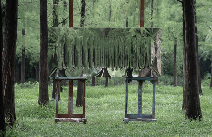 在《視網膜》系列作品中,他著力對視覺生成的內在機制進行審視和思考。不銹鋼鏡面材料作為意義的載體,被轉化為一張外置的“視網膜”,鏡面的映射特質將作品周遭的一切變成了畫面中的一部分,構成一幅沒有明顯邊界的圖像,任何經過鏡面的物象,或者投射,或者侵入,或者掠過,呼之即來,稍縱即逝。事物因時間而不可捉摸的本性由此得到了“自動呈現”。人們對外界的理解都是基于外像在人的視網膜上成像,再通過視神經傳送到大腦而完成的,通過這種被動的“吸收”,形成了我們意識中的世界。某種意義上說,是介質決定了我們看到什么。曾曦通過這一系列作品試圖表達這樣的質疑:即使是視網膜的留痕,就必定真實可信嗎?這張脫落的、因理性而外置的視網膜,提醒我們思考所謂現實的世界、所見的世界以及意識中的世界的關系。