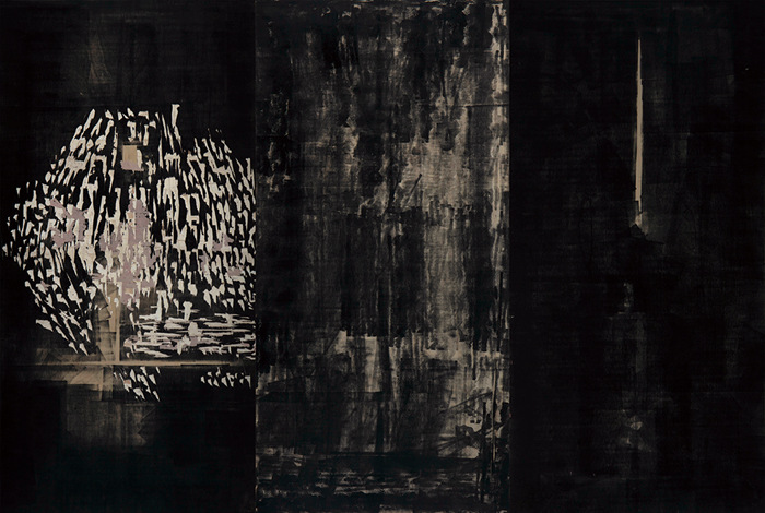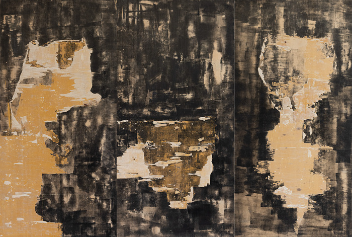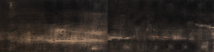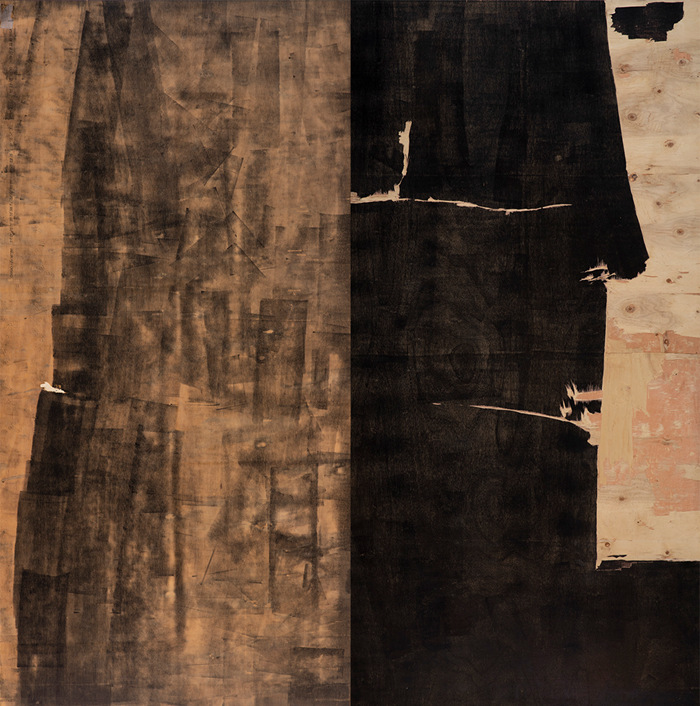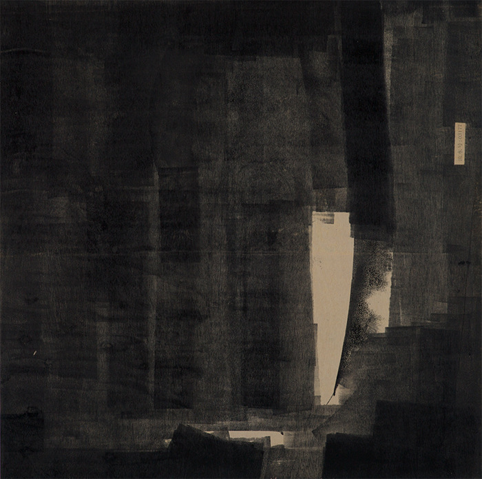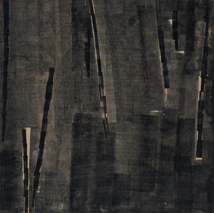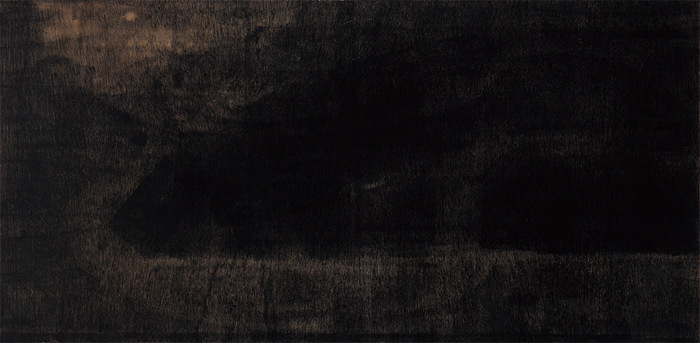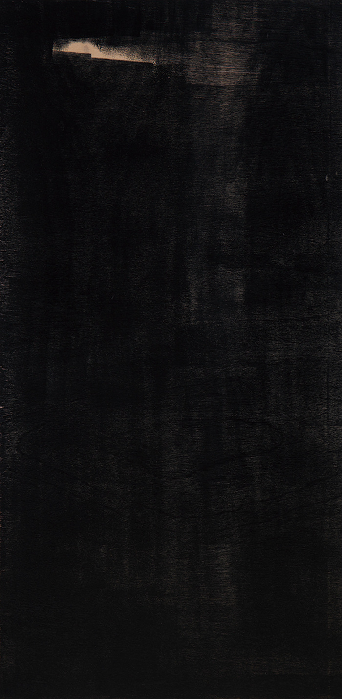 王綺彪改變了油墨和木板的傳統功能,在他這里,油墨成了他的“板象藝術”唯一使用的“色彩”,他將沾滿油墨的滾軸變成沾滿“色彩”的“畫筆”,在木質板材表面滾動。一方面,手臂不同的壓力和滾軸的快慢形成了墨色隨機的深淺濃淡變化,使油墨在板材上呈現出水墨大寫意神韻,卻又極富油畫般的厚重感和塑造性;另一方面,他通過油墨滲向木紋肌理產生的板材纖維筋絡的僨張,以及板材自身豐富錯落的天然木色,共同形成酷似中國古代帛畫的面貌,產生深沉感和神秘性,距離感和深邃性,營造出一種陌生又熟悉的奇異空間。這個奇異空間里,王綺彪一刀未動,傳統木刻版畫的命脈:刀法,在此消失殆盡,繼之而來的,是王綺彪的“墨·板”世界的誕生。
