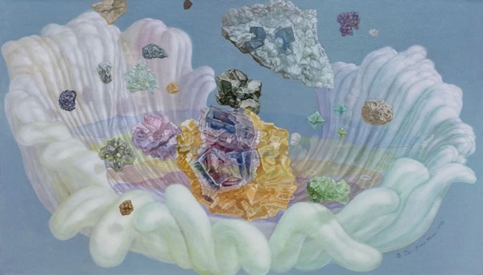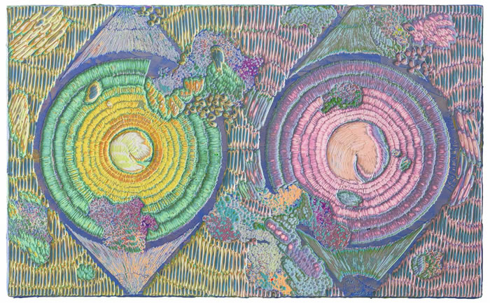 姜淼的作品是畫又非畫,山水又非山水,在她耗日費時所描繪的宇宙世界中,層層迭迭的色彩蘊藏著無限的時空與氣場,經過刻刀、畫筆下的表面語匯或符號,靜靜地釋放出生命的能量。