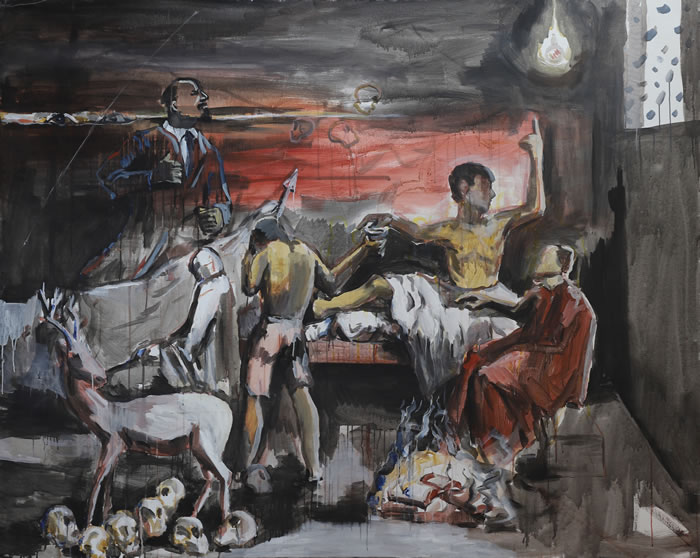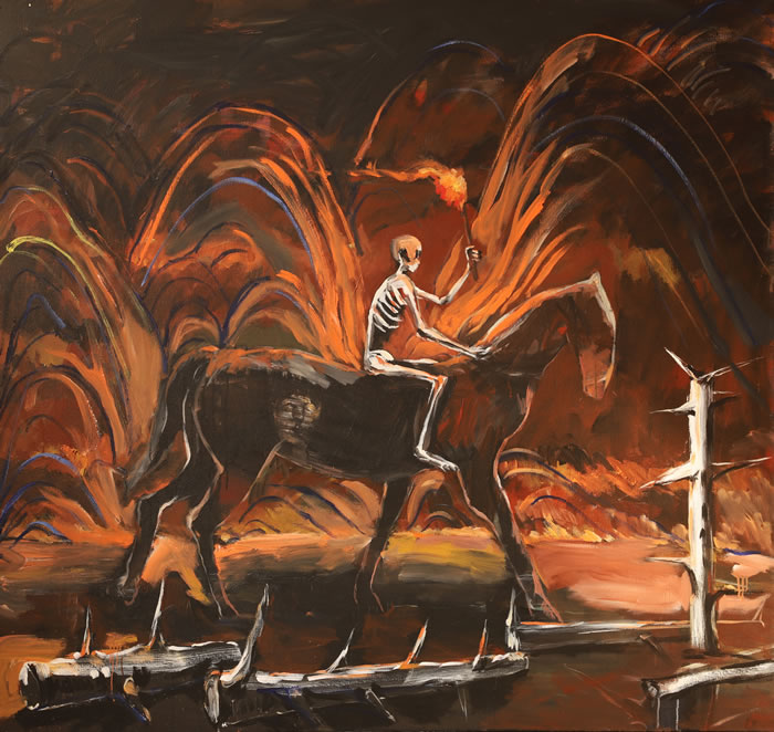 如果說“盜火”帶著一種堂吉訶德式的理想與對世界的樸素想象,那么在繪畫中如何實現且踐行自己的理念,并把現實、理想與想象熔入自己的整個藝術實踐中,鍛造一個個人化的烏托邦世界,這是藝術家波西米亞式的狂熱?;鸢?、荊棘、領袖和諸眾反復出現在翟春陽的作品中,荒誕而現實的景觀雜糅著藝術史中的經典圖式片段,這些構成了翟春陽繪畫中充滿象征性和隱喻性的符號。在作品《歸》中騎著駿馬的骷髏舉著熊熊燃燒的火把穿越滿布荊棘的暗夜,高聳而未知的群山充滿未知的壓迫感,但是又伴隨著火光一起燃燒,作品帶著某種浪漫主義的想象,當然無疑更是現實世界的隱喻,正如堂吉訶德的歸來,命運是注定的,但身后的世界是不可知的?!短焯谩穭t借用了米開朗琪羅在《創世紀》中上帝與亞當食指觸碰的瞬間,在《創世紀》中,上帝從天而降伸出右手食指,向神情茫然的亞當伸出的左手食指注入神明的靈魂,而在翟春陽的作品中,高臺上幾欲退縮的盜火者舉著火把似乎在阻斷亞當與上帝的觸碰,而臺下瞠目而視的諸眾緊張地看著這驚險的瞬間。這是一個歷史和現實的隱喻?!读袑幵谖业墓ぷ魇摇穭t戲謔地把自己瘦弱的身軀描繪成法國大革命時期新古典主義畫家大衛《蘇格拉底之死》中即將飲下毒酒的哲學家蘇格拉底,諷刺的是遞毒酒的也是自己的背影,而列寧在紅場面向群眾演講的經典一幕在天際若隱若現,似乎在控訴這一切,又似乎在布道。象征性的鹿踩踏著滿地枯骨回首張望,沒有人在聆聽自己最后的演講,無人在乎藝術家之死,就像蘇格拉底,大家聽入迷了,忘了老師即將被迫喝下毒酒。翟春陽慣于運用一種像新表現主義畫家那樣荒涼、恣意且悲愴的畫法表現歷史和現實的隱喻,正如艾略特的《荒原》(4)所傳遞的那種蕭瑟感。這或許也是“盜火”的隱秘之因。