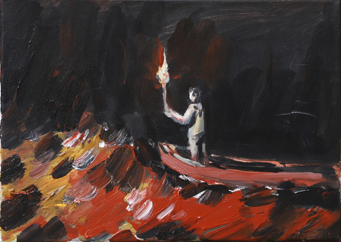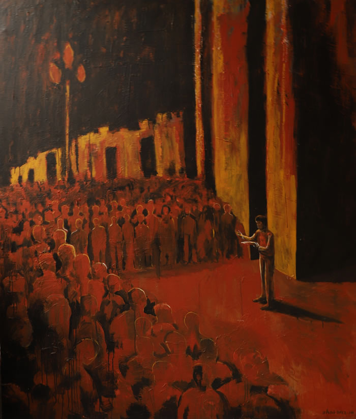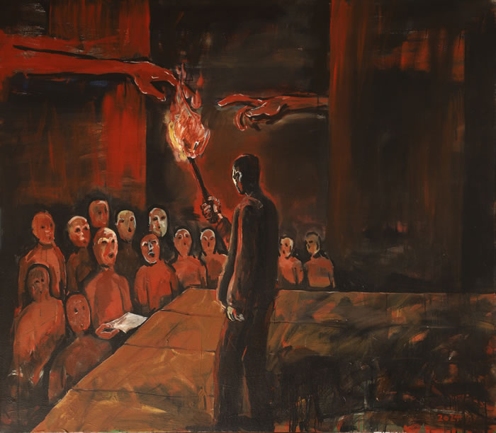 翟春陽的繪畫中反復出現擎著火把的人,火把的光芒似乎在指引著某個方向,同時也照耀著無意識地聚集在一起的荒誕的人群。這是一個隱喻——為諸眾帶來光明與熱情的盜火者隱喻,這個隱喻并非普羅米修斯從太陽神那盜火種為人類獻祭般宏大,對翟春陽而言,這是一個反復出現在腦海中的形象,揮之不去因而信手涂繪,或許,這個盜火者的隱喻僅僅只是向內的。另一個關于火的隱喻或許更接近翟春陽的真實意圖,在柏拉圖的“洞穴之喻”(3)中,有一個有意思的推論:如果逃出洞穴的囚犯看到了真實的世界,他將如何說服那些把墻上的影子當作真實世界的囚犯放棄虛幻的執念?這個說服的過程意味著某種危險,因為他出走看到了真實的世界之后,看墻上的影子甚至不如一直呆在洞穴里的囚犯看得更清晰,他的說教很可能被當作某種愚蠢的行為,最后的結局很可能不是為洞穴里的囚犯指明出路,反而有可能被囚犯們孤立甚至群起而攻之。但是如果出逃者盜走了囚犯們身后的火把,或許囚犯們會意識到墻上的影子的虛無性并進而關注到自身存在及改變命運。翟春陽對繪畫藝術的堅持以及對藝術圈的疏離一方面意味著對傳統理念的悖離,另一方面也意味著精神上的自我重建。翟春陽正是像一個逃出洞穴的藝術家,卻又試圖回到洞穴做一個繪畫藝術的盜火者,他在繪畫和藝術上的實踐組成了一個綿延的“盜火計劃”。
