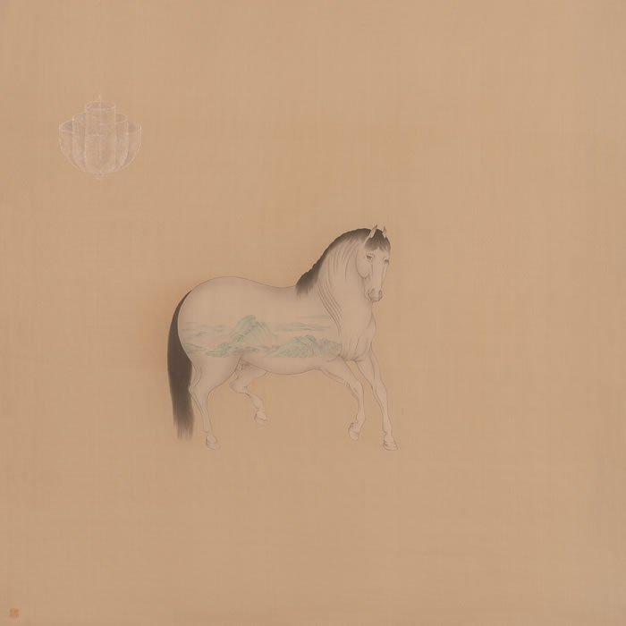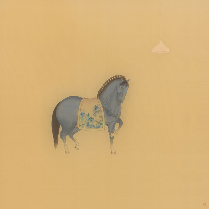 女性視角述情懷。隋宜航的藝術在情感的表達與傳遞方面,顯得異常敏銳和細膩,對?日常生活細節的關注,使她能夠捕捉到生活中不易感知的情緒波動和不易察覺的靈性瞬間。她筆下的鞍馬,即承魁梧矯健、氣度雍容的古典樣態,又有自信內斂、傲然獨立的自我意識?,F代燈具等道具的引入,打破時空壁壘,進入超現實的夢境,感官的豐富性與色墨的純粹性增添了畫面的層次和內涵;符號的寓意和有意味的形式,通過“馬”與“燈”等器物,構成一種洞察日常與人生的內心獨白,充滿了女性對日常的珍惜,對生命的關愛。