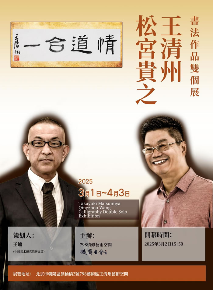 漢字,是東方文明的根系,書法,則是這根系中生長出的不朽之花。它以筆墨為媒介,承載著千年的哲思與情致,在點畫之間構筑起精神的宇宙。2025年仲春,北京798藝術區迎來一場跨越地域與傳統的對話——“情道合一——王清州與松宮貴之書法雙個展”。這場展覽以“合”為名,以“道”為核,以“情”為紐帶,邀約中國藝術家王清州與日本書道家松宮貴之共啟一場跨越國界的筆墨對話。此次展覽不僅是兩位藝術家個人藝術成就的展示,更是中日兩國文化交流與藝術對話的重要平臺。