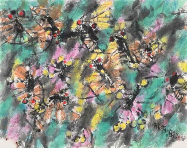 正如王魯湘先生《說說馮鐘云的畫》一文中所述: “他的畫半抽象半具象,遠看覺得畫了個這畫了個那,近觀又看不出是個啥,鳥非鳥,花非花,石非石,但好看,墨韻蒼郁,色彩斑斕。畫的人也一樣,只是有個影,不辨雌雄,遑論五官與表情,但生動,生龍活虎的……馮鐘云的畫弱化了線條,強化了色彩,這使得他的水墨畫看上去有很強的時代感和都市氣息,我想這一定與他生活在澳門有關”。