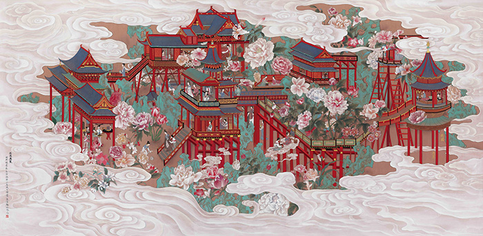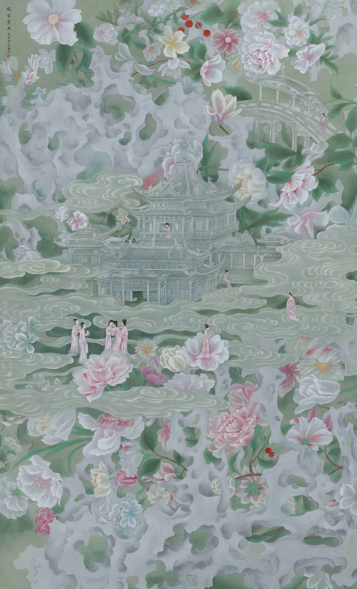 “灼灼其華”取自《詩經》,字面意思是繁花盛開似火,引申意為美麗女子的風華正茂。這也許是最能概述王依雅藝術創作形態的詞匯。她的畫面上滿眼皆是花團錦簇的景象,亭臺樓閣掩映,仙女們居游其間,可謂是閬苑仙葩,美不勝收,是超越現實生活的夢境、幻境、仙境。