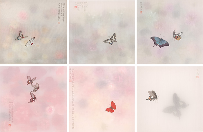 蝶言 30cm×30cm×6 絹本水墨設色、仿生花、蝴蝶標本 2025