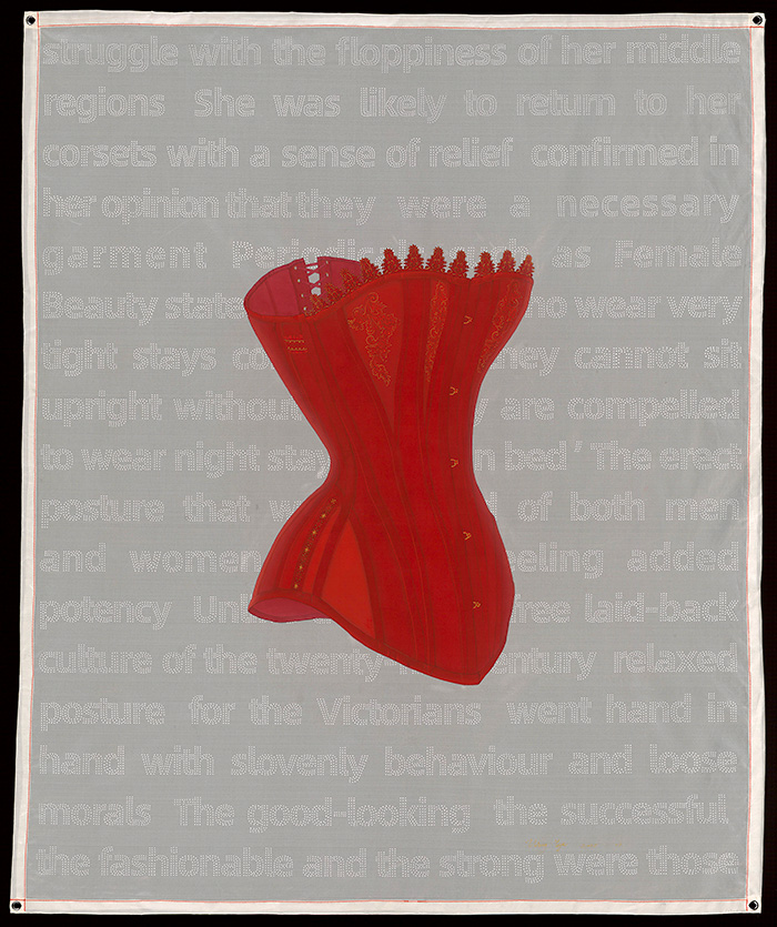 在“繁空錄”系列中,王依雅引入了“虛空”的概念,通過華貴奪目的皇后冠,展現了一切榮華終歸于塵埃的警世恒言,這也奠立了其藝術的思想基調。隨之,“水上安可居”系列描繪的是煙波浩蕩的大海中,由亭臺樓閣與繁花構成的仙船正駛向自由極樂的永生世界。仙船既是渡過虛妄、艱險、困厄的載具,也是仙島本身?!鞍V園”系列則是更聚焦個體的命運,以園林物象為主題,描繪女性們纏綿悱惻的愛情故事,尤其是將西方藝術史上的名作諸如《奧菲利亞》等彩印后與之并置,展現出跨越時間和空間的敏感。最新的“女誡”系列,王依雅嘗試掙脫那些詩意的修辭,她用被操縱的皮影、歐洲宮廷的塑身衣、象征禁錮的雕花木板直言不諱,皆是對被縛的女性命運的喟嘆。