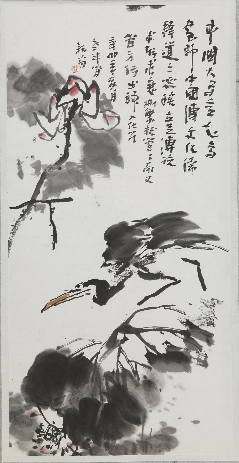 釋文:中國大寫意花鳥畫即中國傳統文化 儒 釋 道之延續 立足傳統 求新求變