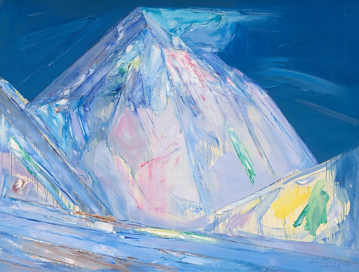 記得在洛絨牛場半夜我睡不著覺,走出帳篷,突然被眼前的景象震驚了。神山央邁勇如白色的金字塔立在眼前,我把睡袋從帳篷里拖出來,一直坐在那里看。一個多小時,星星圍繞旋轉,太震撼了。很快,天陰了要下雨,一切又消失了,太神奇了。我現在再來回憶,對這批畫(《神山》)還不滿意的是什么?是一種精神的東西,精神寄托的問題解決不了。我當時現場也記一些東西,回來再畫,腦子里有一座座的山,但是畫不出來那種感覺,跟現場看到的震撼感還是差太遠了。
