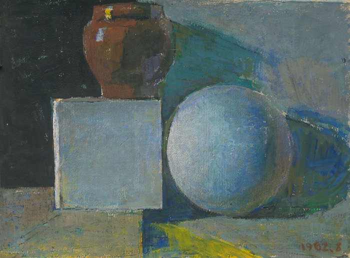 1962年的這張水彩畫,是我剛剛開始當教員,備課。我畫了幾個單色的、褐色的幾何形體,來講透視。那幾張其實比這張畫的要好,但都找不到了,只畫了這一張帶顏色的,這張畫能留下非常特殊,它當時是被鑲在一個鏡框里。當時我用報紙墊照片,報紙里夾著這張小畫。后來搬家的時候,拿出這個框來裝家人的照片,發現了這張畫,挺有意思的。當時我們校長批評我說,你畫幾何形體為什么沒有大調子,你怎么畫一個面?我當時還跟他犟,我說我有一點面,但最后還得按照要求來畫標準的透視關系備課。雖然我當時的能力還不太夠,但很想強調方、圓,構成上、更平面化的以及紅黃藍這些初始顏色的關系。