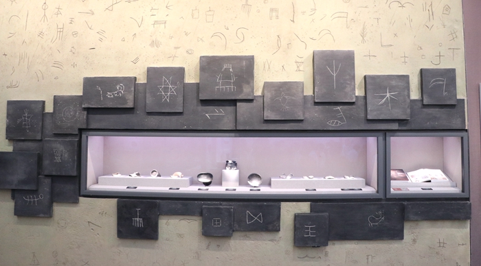 良渚博物院展廳內,刻符陶片的展示