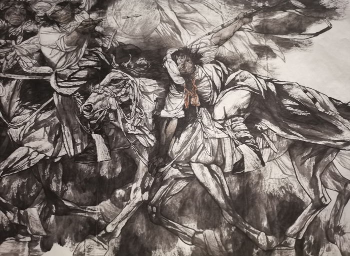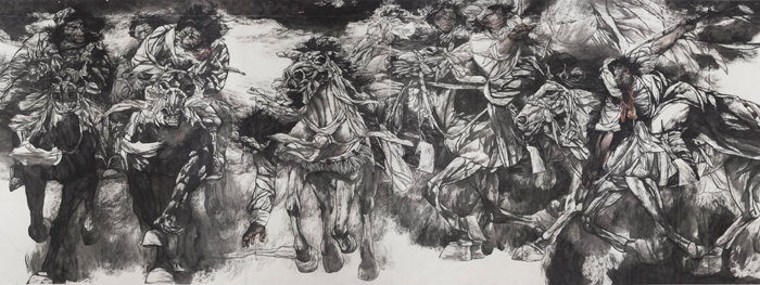 李伯安老師的代表作《走出巴顏喀拉》是他在生命的最后10年完成的傾力之作。作品高1.88米,長120米,畫面所描繪的人物數量多達266人。長卷內容共分十段,分別表現了生活在黃河源頭藏民的生活情景、宗教活動、生產娛樂的場景等十個主題,畫面蒼渾悲壯,筆墨蒼勁灑脫,是一幅極其震撼人心的巨作。如果說當前我國文藝創作現狀是“有高原缺高峰”的話,那此巨作算得上是當今中國人物繪畫的高峰作品之一。