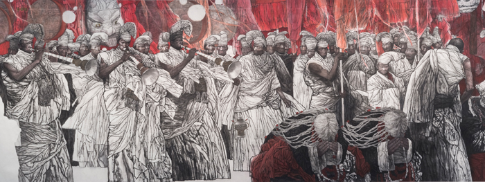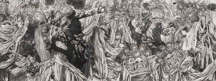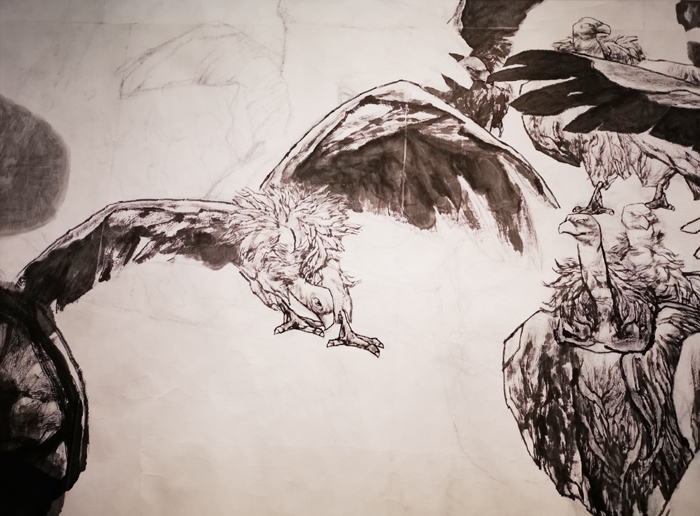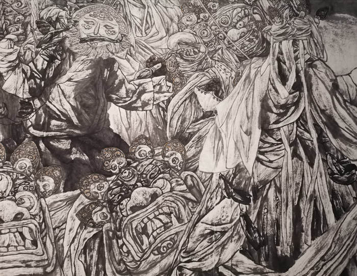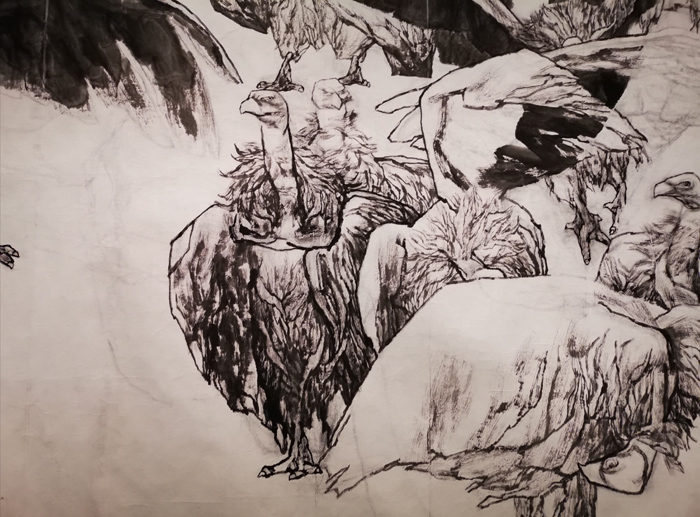 他為此作品傾盡了一切,最后甚至以生命來為看似“未完成的作品”畫上了句號。當我看到第十部分的末端時,不禁打了一個冷顫。這一部分畫得是天葬,那面朝大地的逝者尸體,那環繞四周的禿鷹,以及那未勾墨的稿線……這一切仿佛都是冥冥之中注定著,仿佛是天命的安排,不由地令人肅敬,令人感慨萬千,了哉,了哉!