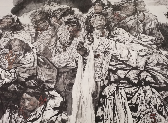 伯安老師以十年磨一劍的毅力鑄就了此畫的歷史地位。有學者評論道:“李伯安及其作品在畫史上是頂天立地的”。的確,伯安老師為此畫歷經了苦行僧般的修煉。十年間,他曾三次深入藏區考察,收集素材,這一過程是相當艱苦的。在創作中,他廢寢忘食,對畫面進行反復修改,多次推倒重來,不計時間成本,只為達到自己預期的畫面效果。伯安老師真切地將世間的悲苦融入自身,再將其化作畫中形象。從畫面中我們可以深切地感受到,伯安老師對此畫作所投入的精力,他在不知不覺中把自己也畫進了作品中。