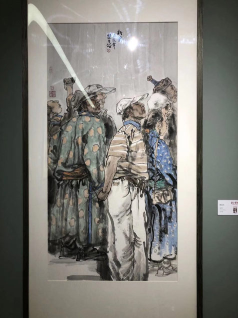 在“守正”之外,展覽也呈現了水墨人物畫近年來的變化。譬如,周榮生的《祈望》(2019)和蓋茂森的《金秋》(2019)中,可以看到水墨人物畫與攝影、漫畫的交融。與《藏民頭像寫生》和《妹娃兒要過河》類似,《祈望》再現的人物也包括少數民族,但其表現形式已明顯異于傳統。首先,作品構圖中,最左邊和最右邊的人物的部分被邊緣擋住,仿佛作品是基于用相機即時捕捉的生活場景。其次,構圖中的人們全部望向畫面右方;一個人手里舉著攝像機,也在拍攝遠處。這暗示著遠處正在舉行活動或發生事件。作品的觀者站在活動觀看者的位置,目光卻并未指向遠處的活動,而是指向旁邊同樣在觀看活動的人群,這是一種更為接近日常生活的平視視角,賦予作品以當代生活氣息。周榮生對人物的塑造簡潔有力,雖則也有對藏民服飾的細致刻畫,但更多讓觀者感受到線條與造型帶來的力量感與趣味性。