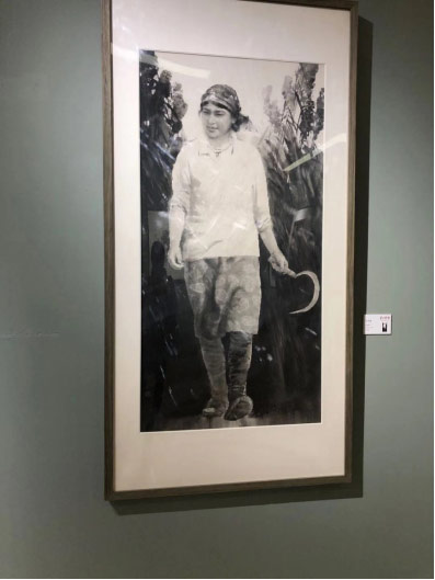 蓋茂森的《金秋》則在延續現實主義表現傳統的同時,與攝影形成了跨媒介的對話。自新中國成立后,徐悲鴻、吳作人等推動了西方素描和水墨畫技巧的融合,這包括更為科學地表現人體比例和結構、捕捉人物動作,也包括更為精確地再現場景中的明暗、光照效果?!督鹎铩穼Ξ嬛信悦娌?、身體、明暗的再現繼承了這段時期的成果。而不同于常見的現實主義繪畫,也異于暗示了強烈色彩的作品題目《金秋》,全作沒有任何彩色,僅有黑、白和不同程度的灰色,這讓作品的整體視覺效果看上更像黑白老照片。畫面上女性的頭巾和裹住小腿的布條也讓人想起上世紀五、六十年代常見的裝束??雌饋?,這件作品既可以看作是現實主義風格的水墨人物,也可以看作一件具有水墨趣味和懷舊氣息的歷史攝影,難分伯仲,這正是這件作品的有趣之處。