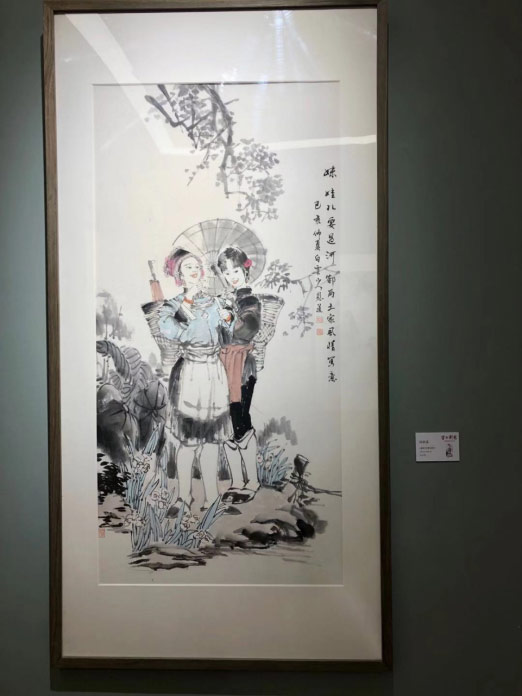 孫恩道的《妹娃兒要過河》表現了兩個土家族女性站在河邊的生活場景。整體構圖取自傳統水墨畫,上有垂枝,下有巖石、水仙、芭蕉葉。對于兩位女性的刻畫強調了她們身著的少數民族服飾,包括她們的紅色頭花、藍色上衣及上衣上的裝飾、油紙傘和背簍。同樣吸引人的還有兩位女性的神態。其中一位張開嘴笑著,手指向河對岸。另一位微微側著身,正在回頭微笑看著河水。她們正在看向畫面外的某個位置,也許是河上的船夫,也許是河對岸的人。由此,畫面具有了某種敘事性,展示了一件正在日常生活中發生的事情。