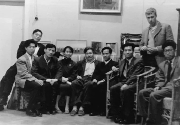 1961年中國留學生訪問蘇聯油畫家楚依柯夫,左起曹春生、司徒兆光、王克慶、馮真、楚依柯夫、張華青、李駿、楚依柯夫之子、蘇高禮