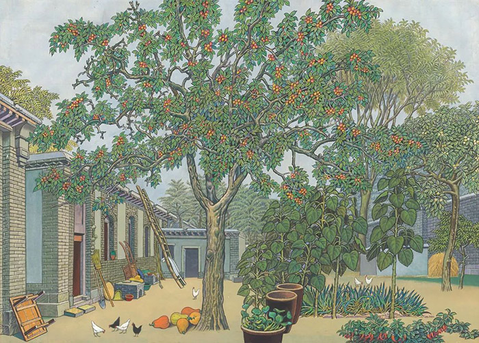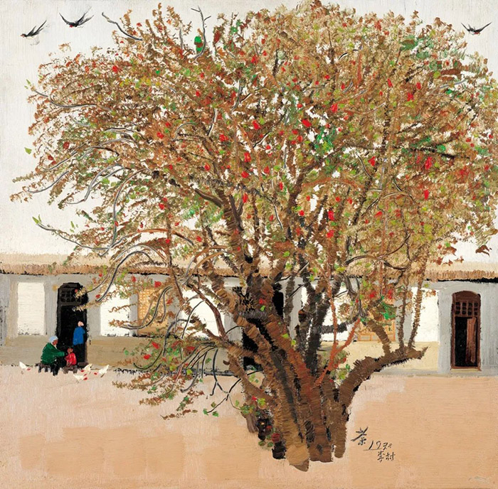 祝大年在李村被稱為“板凳畫家”。他與吳冠中畫風截然不同。但對于這兩幅作品,他們都是將主體果樹放置畫面中央,毫不掩飾地贊美——對豐收的贊美,對土地恩賜的贊美,也對棗樹在貧瘠土地上依然奉獻的贊美。祝大年作品中,院子里是一棵高大挺拔的傘狀棗樹,粒粒果實飽滿晶瑩,似紅寶石一般。樹下農具井然擺放,家禽悠閑覓食,院子有限的地方還種植蔬菜,這是一戶勤勞整潔的人家,這應該也是祝大年的房東家。