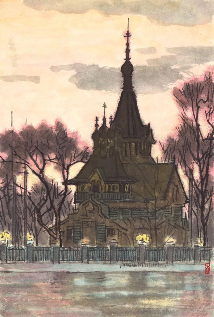 哈爾濱是一座充滿異域風情的東北城市。具有標志性的圣·尼古拉教堂是在俄國沙皇尼古拉二世支持下,于1900年在哈爾濱紅博廣場建成的。1966年8月,因“破四舊”被紅衛兵拆除。2006年復建,命名為“尼古拉藝術館”。顯然蕭淑芳和李斛畫的是原建的尼古拉教堂。
