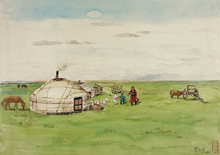 蕭淑芳和古元這兩幅作品作于同年,是一起去內蒙寫生而作,表現的景物也基本相同:氈房、牛羊、農具,甚至婦女服飾都是喜慶紅色,一派祥和的草原生活畫卷。前者作品天空和草地五五分割,畫面柔和溫婉;后者則俯視草原,利用水彩的優勢,將大面積的天空色彩變幻表現得淋漓盡致,也讓觀者心曠神怡。