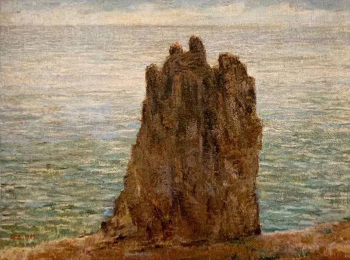 許幸之作品中,主體鷹角石迎著朝陽,水面平靜無波,遠處白帆點點,再遠去鴿子群飛,一幅愜意祥和的畫面。宗其香作品中,巨石屹立,微波蕩漾,船只往來,游人散布。李瑞年則摒棄了一切事物,畫面純粹,海天相連,鴿子窩靜默著,屹立千年。