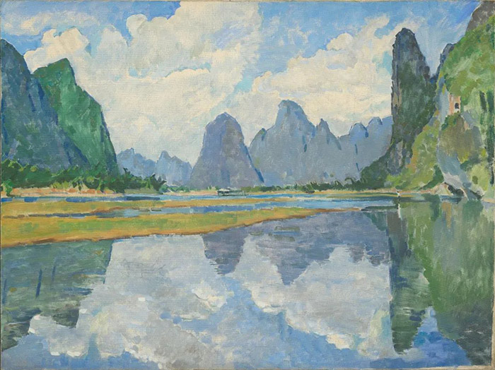 李斛《漓江春曉》灰白墨色表現,右下角一團粉色桃花點亮春天;大師兄馮法祀依然是大刀闊斧,用色塊塑造《桂林風景》之明澈。漓江倒映桂林,學生也是老師的明鏡。