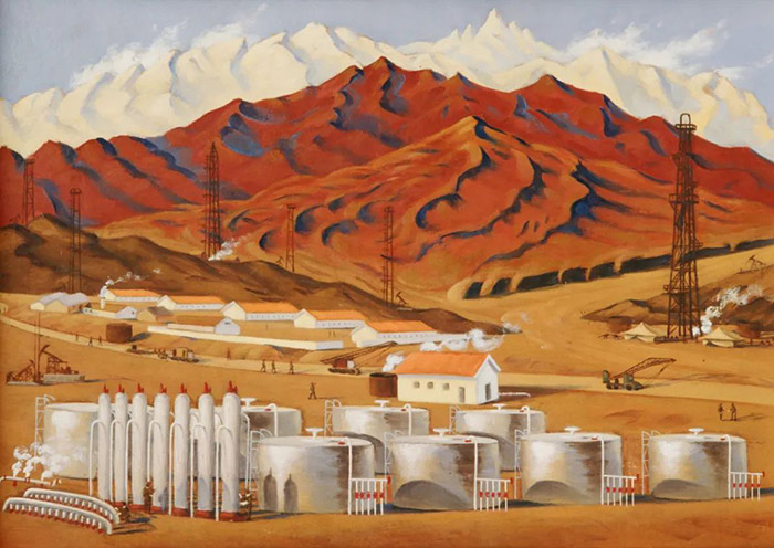 許幸之作品《油站朝暉》,表現西北油田開采的場面。朝暉既是沐浴朝陽,又寓石油這一朝陽產業。整個畫面白、黃、紅,耀眼奪目卻不混亂,銀白色的油站與遠方的紫紅對比強烈,又與盡頭的白色呼應。油罐、房舍、鉆塔井然,給人以秩序美。