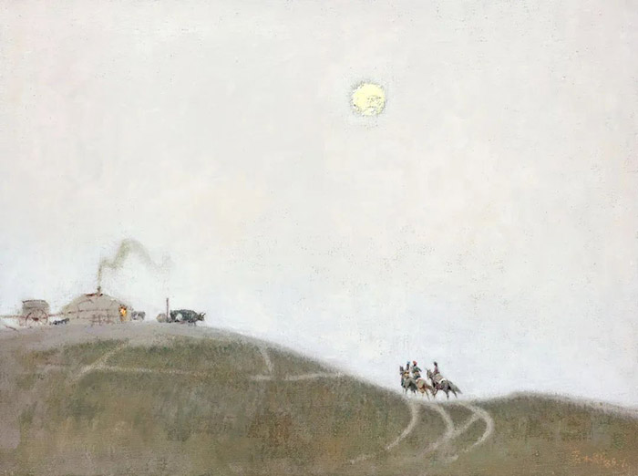 騰格爾是內蒙古音樂界的一張名片,妥木斯則是內蒙古美術界的一面旗幟。不同于以往作品明艷的色彩,這是一幅輕描淡寫:清月高懸,暮色蒼茫,外出的人急馳而歸,氈房炊煙裊裊,那一點火光是家人的等候,是家庭的溫暖,也是希望的火焰,遙呼圓月,一縷溫情在心頭。